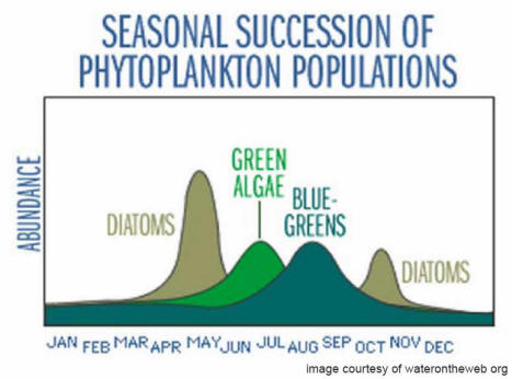 We are at the start of the blue-green algae season (chart below) which as the chart indicates starts in June and subsides at the end of October. There was some clumping of blue-green algae cells observed in the lake with minimal accumulation of surface scum around the lake at this time. It is important to remember that blue-green algae is a natural part of the seasonal succession of phytoplankton and will be controlled as necessary. Safe practices during summer months in any lake involves not drinking untreated lake water and rinsing off when you are done recreating in the lake.